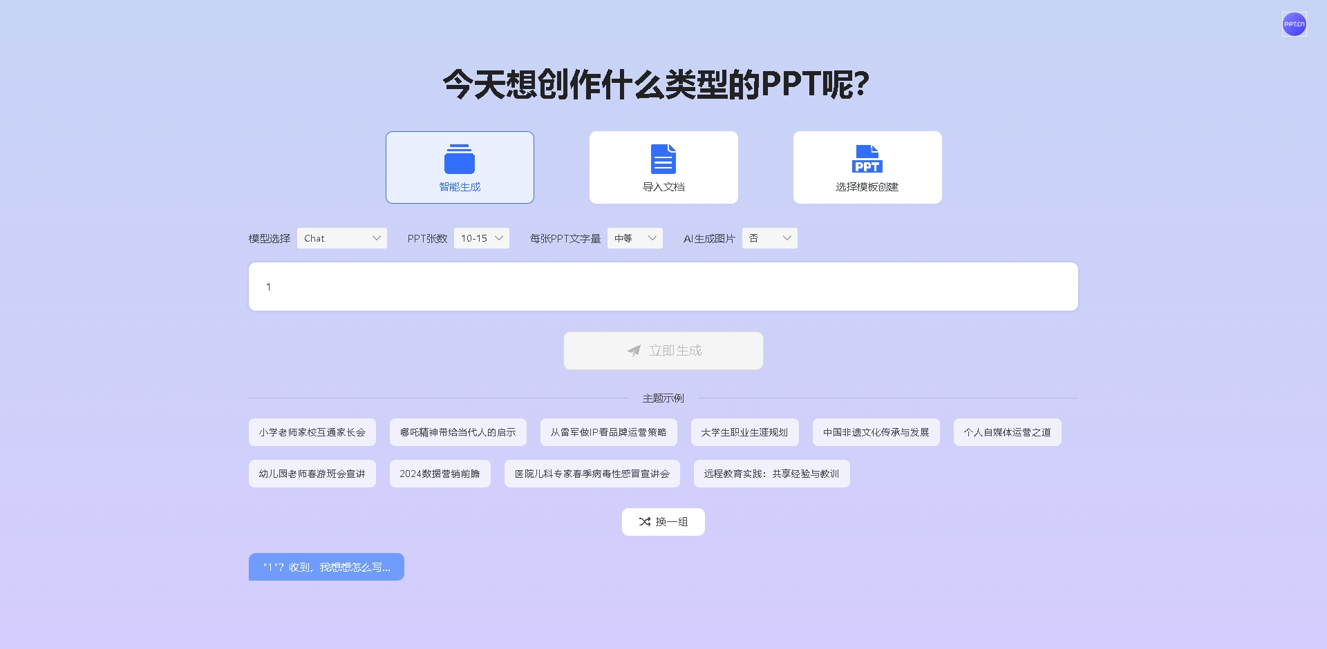 先說最戳我的AI智能生成功能,簡直是手殘黨的救星!不用自己一點(diǎn)點(diǎn)搭框架,只要在輸入框里敲個(gè)主題,比如“端午民俗分享”“山水畫賞析”,短短幾秒,完整的PPT框架就出來了。它連內(nèi)容邏輯都幫你理順,從開篇引言到核心內(nèi)容再到結(jié)尾總結(jié),完全不用費(fèi)腦子想結(jié)構(gòu),這不比自己熬夜摳大綱香多了。